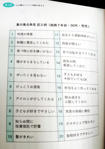 夫、義父母、長男、次男、実父母、そして最も重要な自分自身の美点も毎日100個ずつ見つけるのです。合計で毎日900個の美点を紙に書き始めました。